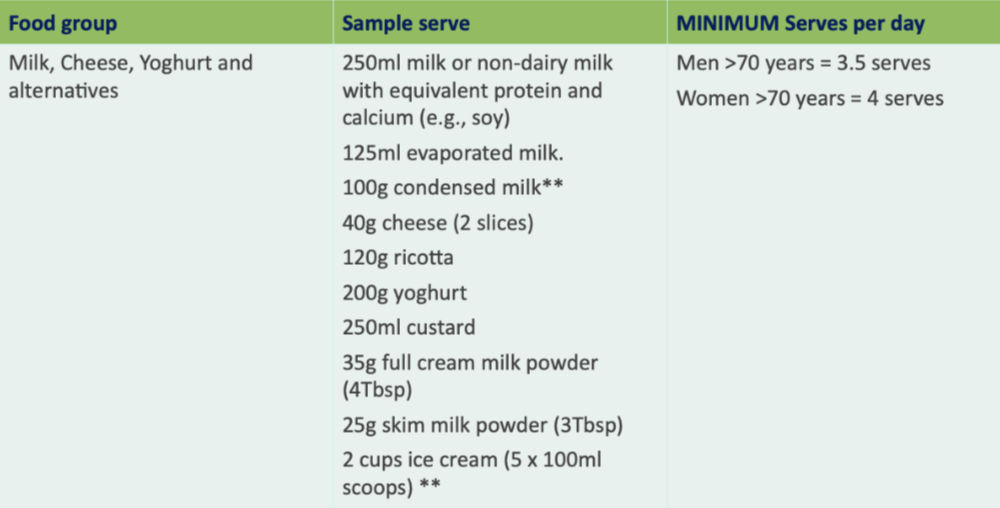 Dairy is an important source of protein for older adults. A serve of dairy is described in the table below.